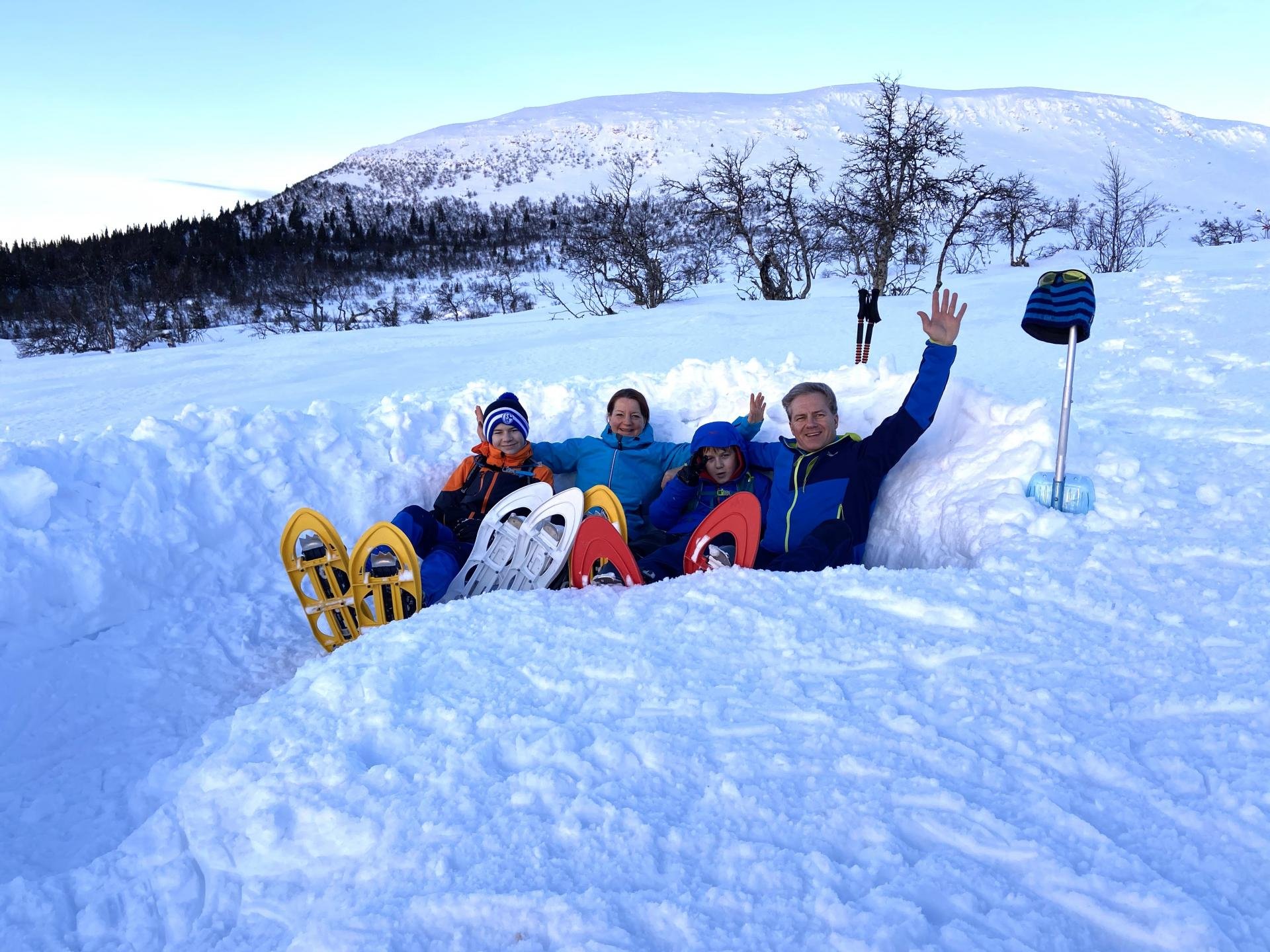 In der Woche steht eine geführte Schneeschuhtour zum vollständig zugefrorenen Njupeskär – Schwedens höchstem Wasserfall – auf dem Programm. Die Wanderung durch den Fulufjäll-Nationalpark eignet sich sowohl für jüngere als auch für ältere Kinder. Schneeschuhe inklusive Stöcke können für geführte wie auch eigene Touren direkt im Camp gemietet werden (15 Euro pro Tag).