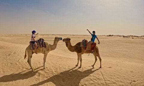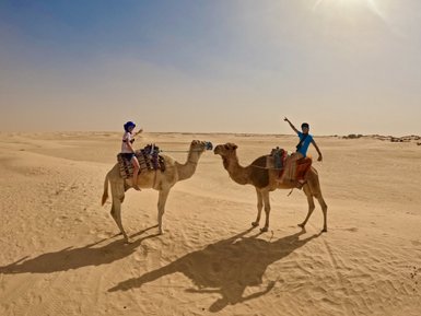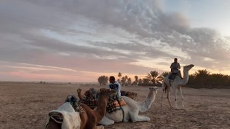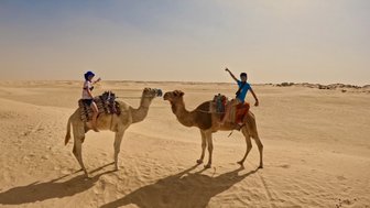 Sobald alle Sachen zusammengepackt sind, geht es nach dem Frühstück wieder zurück in die Zivilisation. Wir verlassen unser Wüstencamp und brechen auf nach Douz, ein kleines Städtchen am Rand der Sahara. Dort unternehmen wir ein spannendes Kamel-Trekking (ca. 1 Stunde) und reiten auf Kamelen nochmal durch die goldenen Dünen der Wüste Sahara. Heutzutage sind es zwar nicht mehr so viele, aber es gibt sie noch: Beduinen, die mit ihren Dromedaren durch die Wüste ziehen. Vom Rücken des Tieres aus können wir die Aussicht und die umliegende Landschaft bewundern.