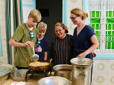 Die Familienreise führt uns weiter zur Oasenstadt Tozeur, wo wir einen beeindruckenden Canyon und zwei wunderschöne Oasen besuchen. Auf dem Weg nach Hammamet erleben wir die altertümliche Stadt Kairouan und lernen die Herstellung einer beliebten tunesischen Süßigkeit kennen. Zum Abschluss können wir diese erlebnisreiche Reise für Familien mit einem relaxten Badurlaub am Strand von Hammamet ausklingen lassen und individuell verlängern.