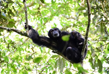 Schimpansen-Tracking im RegenwaldHeute erleben wir bereits das nächste Highlight unserer Reise. Endlich sehen wir die ersten Primaten. Die Kyamboura Schimpansen. Nach einem kurzen Briefing Ihres Rangers geht der Führer voran und führt Sie durch den Regenwald. Schimpansen sind sehr mobil und bevorzugen, sich von Baum zu Baum zu schwingen, weshalb ihre Sichtung nicht hundert Prozent sicher ist.