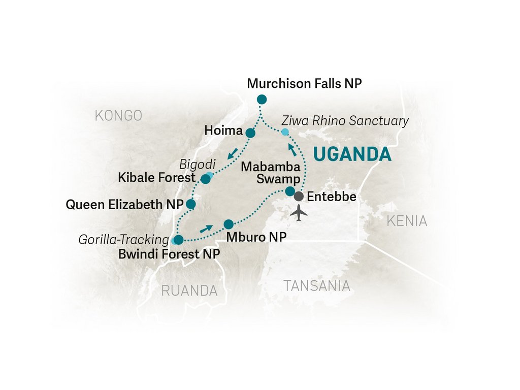 Entebbe • Murchison Falls Nationalpark • Kibale Forest • Queen Elizabeth Nationalpark • Bwindi Forest Nationalaprk • Mburo • Entebbe