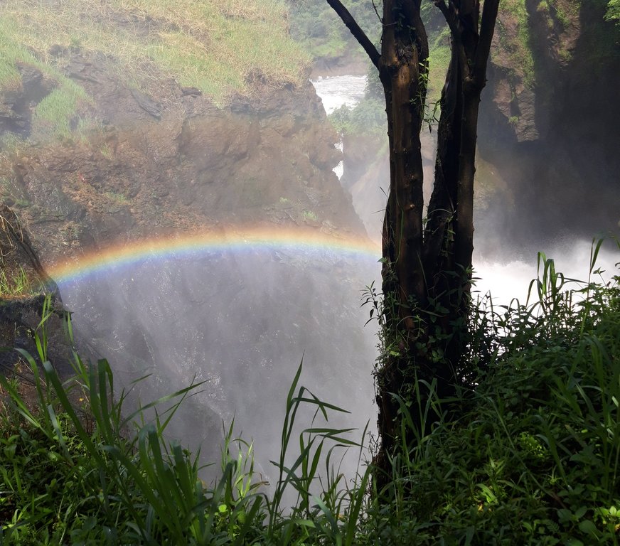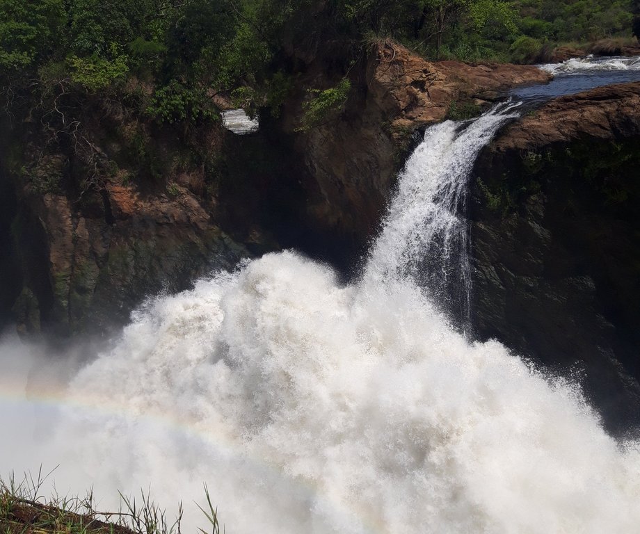 Nach unserem Safari-Abenteuer fahren wir zu den „Top-of the Falls“ einem Aussichtspunkt, von dem aus wir die stürzenden Wassermassen der Murchison Falls von oben beobachten können. Wir kommen ganz nah an das beeindruckende Wasserspektakel heran. Nur schwer vorstellbar, dass dieser riesige Strom sich seinen Weg über knapp 6.650 km Länge bis ins Mittelmeer bahnt. Die tosende Naturgewalt von 12 Kubikmeter Wassermassen, denn diese Menge fällt in jeder Sekunde durch die Schlucht, erzeugt durch die hohe Luftfeuchtigkeit einen permanenten Regenbogen. Das ohrenbetäubende Dröhnen der Wassermassen lässt einen ehrfürchtig die Kraft der Naturgewalten bestaunen.