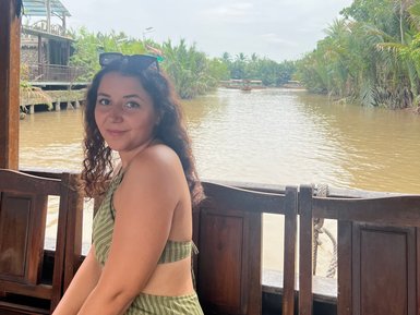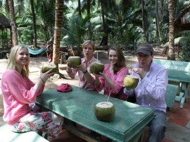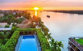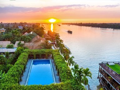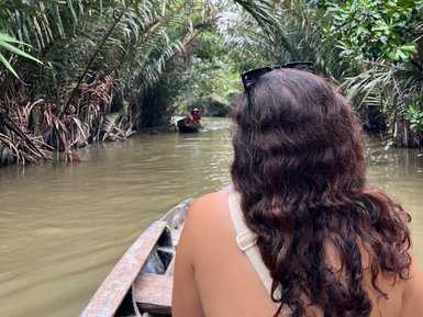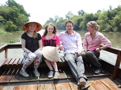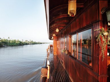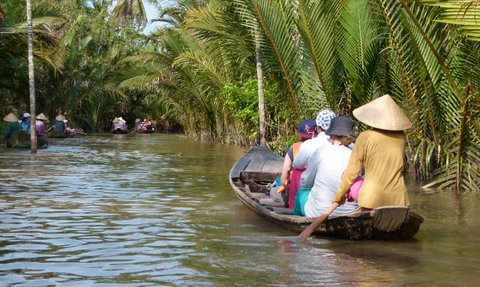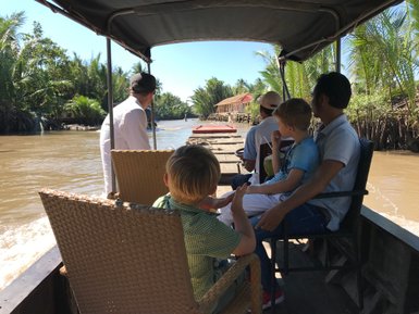 Nach dem Frühstück fahren wir in das fruchtbare Mekong Delta. Nur etwa 3 Stunden Fahrzeit von Saigon entfernt, findet sich hier das ländliche Vietnam: Endlose Reisfelder, sanft wehende Palmen, schwer hängende Bananen an den Stauden, Reisbauern mit den typisch vietnamesischen Reishüten, Wasserbüffel an den Flüssen und schwimmende Märkte mit bunten Waren aus dem Umland. Hier erwartet uns das nächste Highlight auf unserer Vietnam Familienreise: Wir checken auf dem schönen Holzboot ein, auf dem wir auch übernachten und genießen dort zunächst ein leckeres Mittagessen.