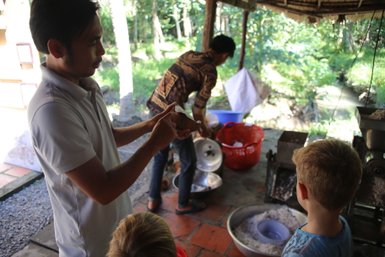 Die heutige Nacht verbringen wir in einem Homestay mitten in der Natur. Die Unterbringung erfolgt in einfach eingerichteten Zimmern und die sanitären Einrichtungen nutzen Sie hier gemeinschaftlich. Während des Mittagessens können wir landestypische, lokale Köstlichkeiten probieren, bevor wir uns aufmachen, um die Umgebung aktiv zu erkunden. Mit dem Mountainbike radeln wir durch Waldabschnitte zum nahe gelegenen Kräuterdorf und wieder zurück zur Unterkunft, insgesamt etwa 7 - 10 km. Hier genießen wir den Abend mitten im Urwald gemütlich am Lagerfeuer – ein echtes Erlebnis für die Kids, welches sicher für den kurzen Verzicht auf den gewohnten Komfort entschädigt.