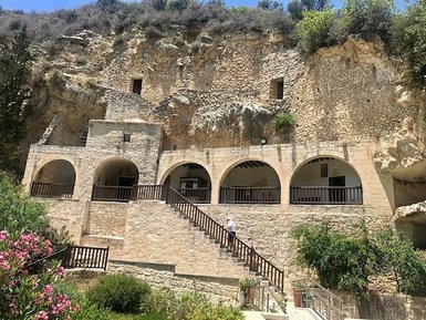 Auf unserem Weg zurück ins Hotel halten wir nördlich von Paphos am Agios Neophytos Kloster. Hier ließ sich kurz nach Mitte des 12. Jahrhunderts der Eremit Neophytos nieder. Das auf 516 m über dem Meeresspiegel erbaute Kloster bietet einen spektakulären Blick über Paphos und beherbergt eine beeindruckende Auswahl byzantinischer Ikonen und gut erhaltener Fresken aus dem 16. Jahrhundert. Am faszinierendsten sind die Felsengrotten über den Klostergebäuden, darunter das Engleistra, in dem der Einsiedler Neophytos angeblich über 45 Jahre gelebt hat.