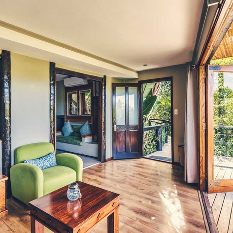 In den üppigen Gärten rund um das Haupthaus befinden sich sechzehn einzigartige Suiten im afrikanischen Stil. Jede Suite bietet ein privates Holzdeck, eine Hängematte, ein Kingsize-Bett und viele verfügen über gemütliche Kamine, die für eine behagliche Atmosphäre sorgen. Gäste können ein köstliches Frühstück auf dem Boma-Deck genießen, während die abendlichen Mahlzeiten in der geselligen Atmosphäre des Haupthauses serviert werden.