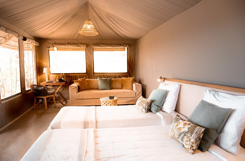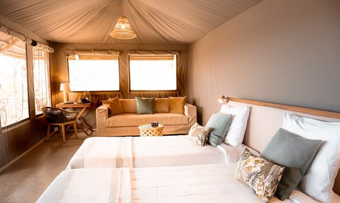 Jede Zeltsuite bietet eine private Terrasse und einen atemberaubenden Blick auf die weitläufige Savanne. Die Zelte sind komfortabel eingerichtet, verfügen über ein Badezimmer mit Dusche und WC sowie Strom rund um die Uhr, dank der umweltfreundlichen, solarbetriebenen Lodge. Die westliche Ausrichtung der Suiten ermöglicht es den Gästen, spektakuläre Sonnenuntergänge zu genießen.