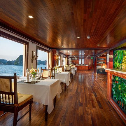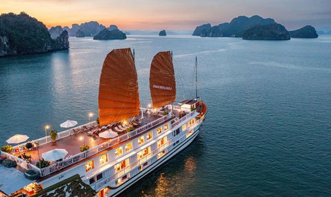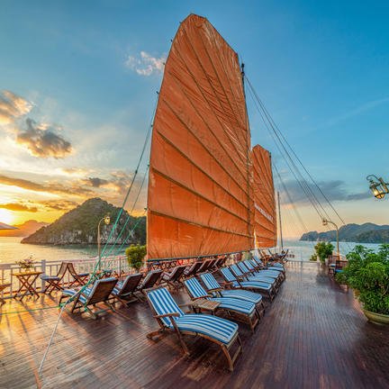 An Bord der stilvollen Indochina Sails Kreuzfahrt erlebt ihr die faszinierende Halong-Bucht auf besonders charmante Weise. Das traditionelle Holzschiff mit seinen eleganten Segeln strahlt zeitlose Schönheit aus und schafft eine warme, authentische Atmosphäre. Mit nur 23 komfortablen Kabinen für maximal 46 Gäste bleibt euer Erlebnis persönlich und ruhig – ideal, wenn ihr die spektakuläre Natur der Bucht entspannt entdecken möchtet.