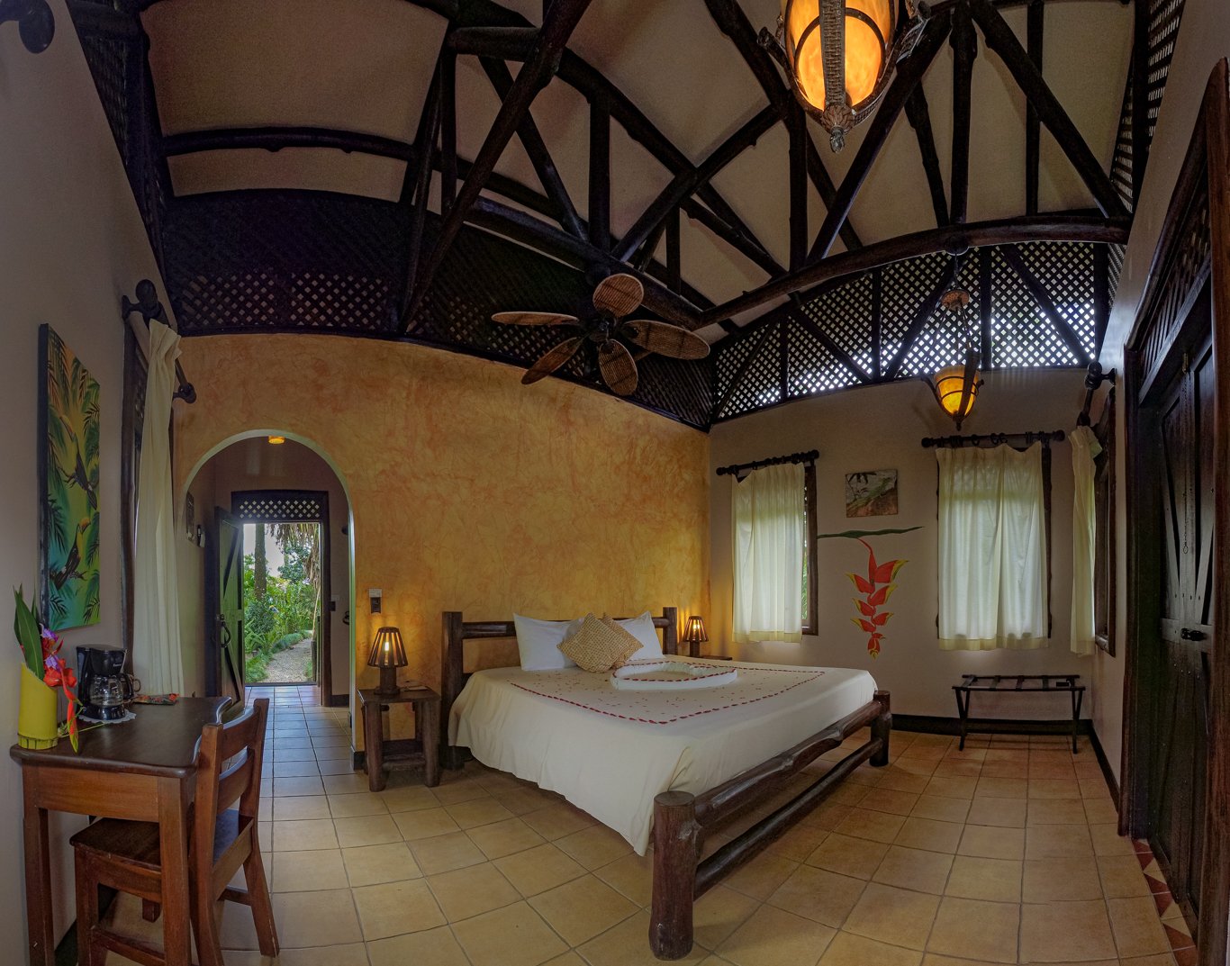 Auf der Unterkunft findet sich viele gemütliche Sitzmöglichkeiten wie Hängematten, von denen ihr auf das Wasser oder den Regenwald schauen und die Natur und Ruhe genießen könnt. Außerdem verfügt die Lodge über mehrere Gärten und einen Pool. Während eurer Zeit auf der Maquenque Ecolodge wohnt ihr in einem gemütlichen Bungalow, der einen Sitzbereich, einen Deckenventilator und ein eigenes Badezimmer besitzt.