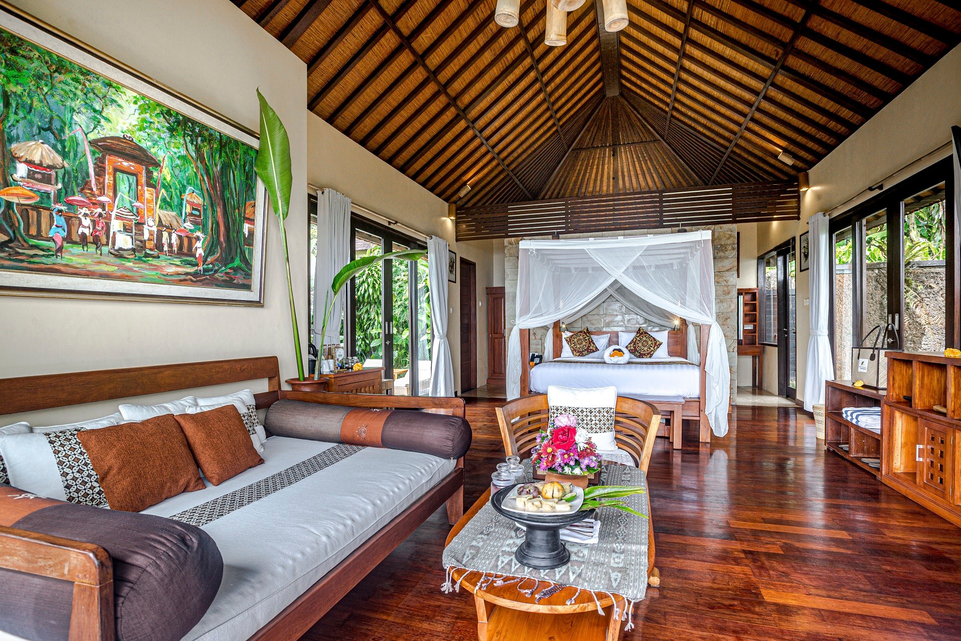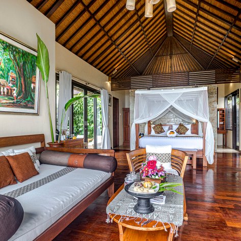 Das Resort bietet euch eine einzigartige Auswahl an Villen und Suiten, die harmonisch in die natürliche Umgebung integriert sind. Die Unterkünfte sind geschmackvoll eingerichtet und verbinden traditionelles balinesisches Design mit modernem Komfort. Große Fenster eröffnen euch traumhafte Ausblicke auf die üppige Vegetation, den Dschungel und die Berge. Private Terrassen und luxuriöse Badezimmer mit natürlichen Materialien sorgen für zusätzlichen Komfort, während hochwertige Annehmlichkeiten wie gemütliche Betten euren Aufenthalt abrunden. Ein besonderes Highlight sind die privaten Poolvillen, die euch inmitten dieser idyllischen Umgebung perfekte Entspannung und Privatsphäre bieten.