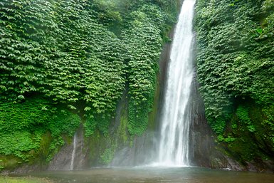 Etwas ruhiger geht es beim optionalen Spaziergang zu, der von den Puri Lumbung Cottages startet und durch die umliegende Natur führt. Dabei erfahrt ihr viel über die Pflanzen und Früchte, die auf Bali angebaut werden. Der Weg führt euch durch Anbauflächen von Kaffeepflanzen, Gewürznelken, Vanille, Ingwer, Ananas, Avocado und vieles mehr. Das Highlight ist der Red Coral Wasserfall, der inmitten einer grünen Oase liegt und imposant wie ein riesiger Strahl nach unten schießt – schon von Weitem hörbar. Der Wasserfall selbst ist beeindruckend, genau wie die üppige Pflanzenwelt um ihn herum. Dort, wo das Wasser nicht hinabstürzt, ist die Felswand stark bewachsen, was zusammen mit den tropischen Bäumen und Sträuchern rund um den Wasserfall eine wunderschöne Dschungel-Atmosphäre schafft.