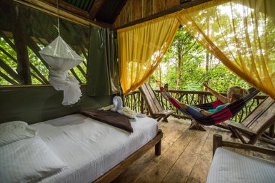 Nach der Nacht in unserem Bungalow werdet ihr am Morgen von den Naturgeräuschen des Urwalds geweckt. Wer ein ursprüngliches Naturerlebnis sucht, ist hier genau richtig. In den Sommernächten stimmen Zikaden ein Konzert an und Montezuma Oropendulas lassen ihren typischen Ruf von den Bäumen erklingen. Besonders auf den teils matschigen Regenwaldpfaden der Lodge lassen sich viele Insekten, Reptilien und Amphibien, aber auch neugierige Säugetiere beobachten. Für Ornithologen ist diese Region ein wahres Paradies.