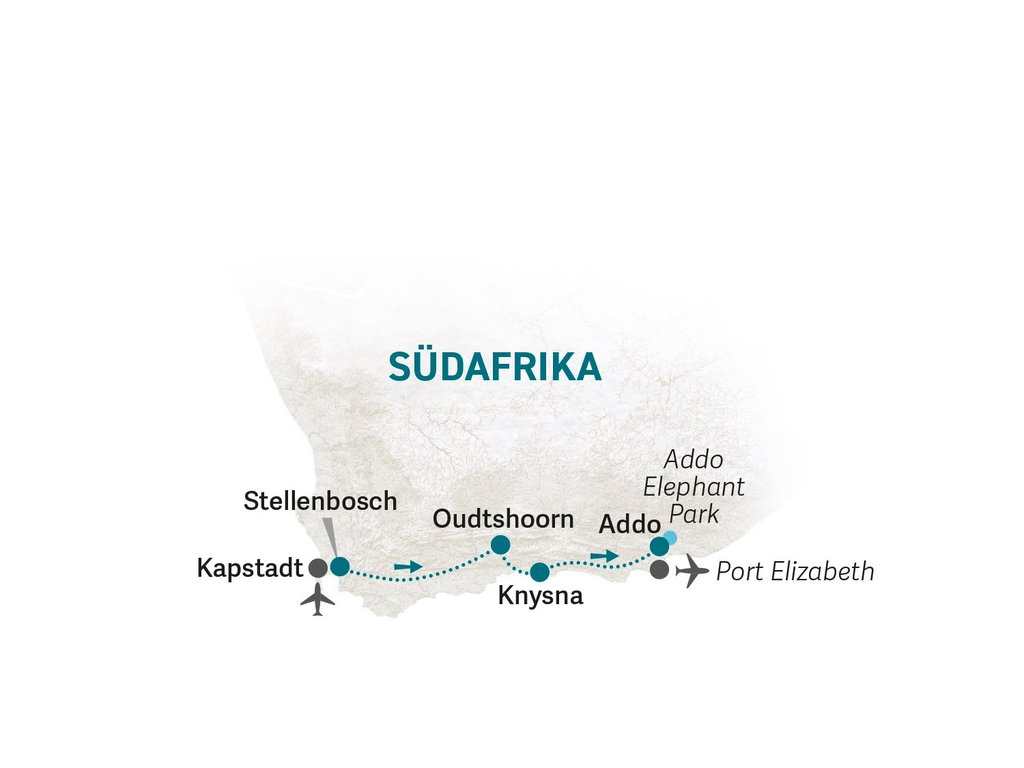 Entdeckt mit eurer Familie 16 Tage auf eigene Faust Kapstadt und seine Umgebung sowie die faszinierende Tierwelt entlang der wunderschönen Garden Route. Der Fokus dieser einzigartigen Reise liegt auf vielen tollen Safarimöglichkeiten für Familien. Vier Nächte verbringt ihr in Kapstadt am Fuße des mächtigen Tafelberg-Massivs und erkundet Sehenswürdigkeiten in eurem Mietwagen. Entlang der berühmten Garden Route geht es danach zu den schönsten und beliebtesten Reisezielen in Südafrika.