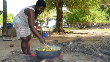 Gemeinsam werdet ihr die Zutaten schälen, schneiden und schichten – erst die Brotfrucht und das Fleisch, dann das Gemüse in die Mitte und die Callaloo-Blätter und Klöße obendrauf. Am Ende lasst ihr alles langsam köcheln, während ihr am Strand spielen und die frische Meeresbrise genießen könnt. Ein wunderbares Erlebnis für die ganze Familie, bei dem ihr nicht nur zusammen kochen, sondern auch die köstlichen Aromen der Karibik kennenlernen werdet!