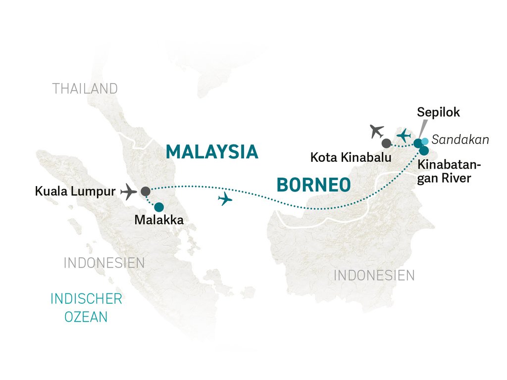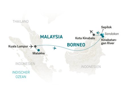 Auf dieser traumhaften Familienreise könnt ihr euch auf spannende Tierbeobachtungen entlang des Kinabatangan, viel Regenwald, weite Teeplantagen, erholsame Stunden am weißen Sandstrand und natürlich die Metropole Kuala Lumpur freuen.