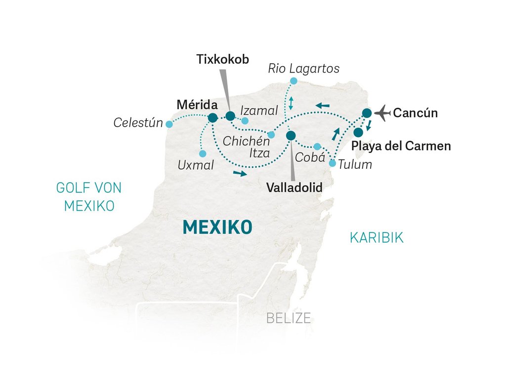 Heute heißt es Abschied nehmen vom Bundesstaat Yucatán. Ihr fahrt wieder Richtung Bundesstaat Quintana Roo und denkt daran, eure Uhren wieder umzustellen.