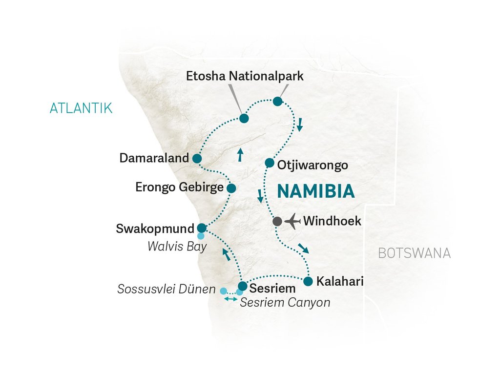 Ihr reist in die Kalahari, erklimmt die Dünen des Sossusvlei, habt die Möglichkeit, Robben bei einer Katamaran-Tour zu beobachten, entdeckt die Felsmalereien der San und sichten mit etwas Glück auch Wüstenelefanten im Damaraland. Als Höhepunkt geht ihr auf Pirsch im Etosha Nationalpark: Nashörner, Elefanten, Löwen, Leoparden, Giraffen, Geparden, Gnus, Warzenschweine und viele weitere Tiere können entdeckt werden. Zum Ende entspannt ihr in einem privaten Tierreservat und könnt die Reise mit einem Sundowner am Pool oder bei einem privaten Game Drive ausklingen lassen.