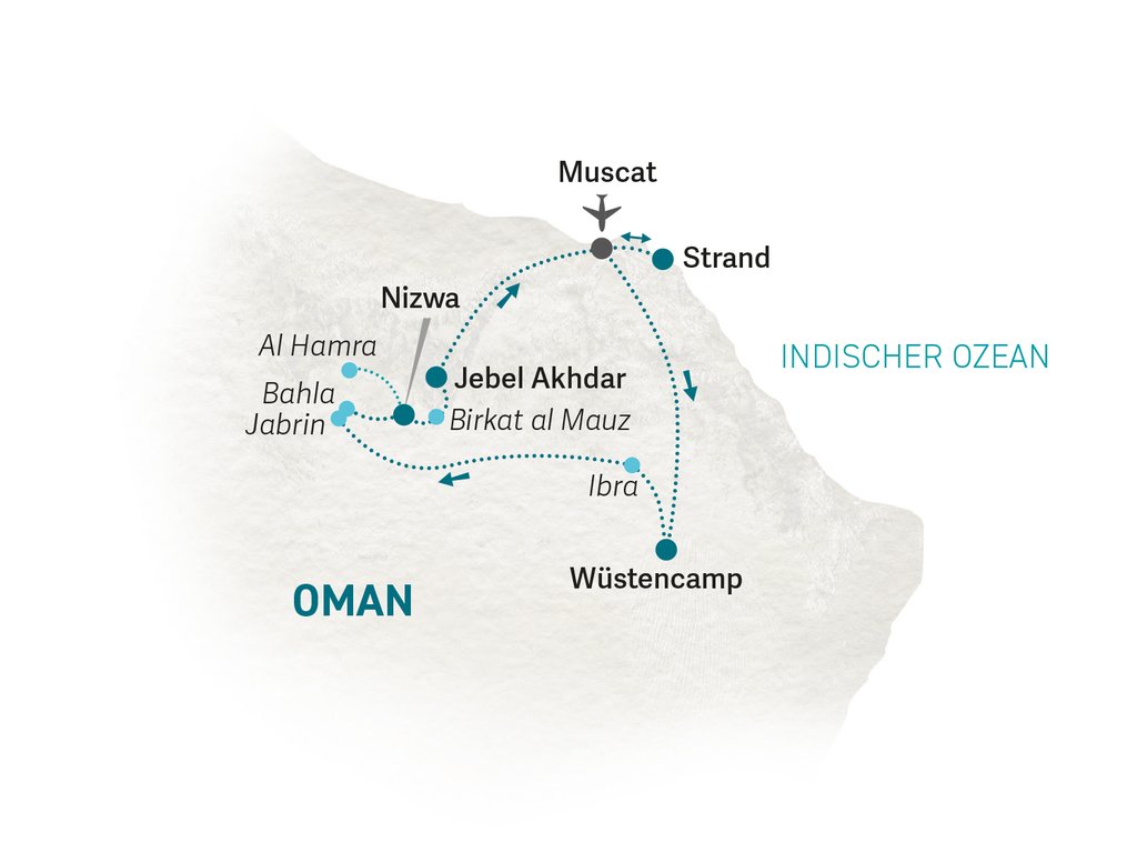 Im Landesinneren erkundet ihr im Anschluss nicht nur die kulturellen Höhepunkte von Oman, wie die Stadt Nizwa oder die historischen Lehmhäuser in Al Hamra, die tief in die Geschichte und Architektur von Oman eintauchen lassen, sondern genießt auch die Erholung im Hochgebirge des Jebel Akhdar. Auf dem grünen Berg haben wir für euch eine aktive Trekkingtour mit privatem Guide geplant! Zum Abschluss eurer Reise entspannt ihr in einem exklusiven Luxushotel am privaten Strand und lasst die unvergesslichen Erlebnisse in aller Ruhe ausklingen. Gern könnt ihr den Aufenthalt hier auch verlängern, denn wir planen eure Route maßgeschneidert und richten uns gern nach euren Wünschen für einen bis ins Detail ausgearbeiteten, individuellen Oman-Luxusurlaub.