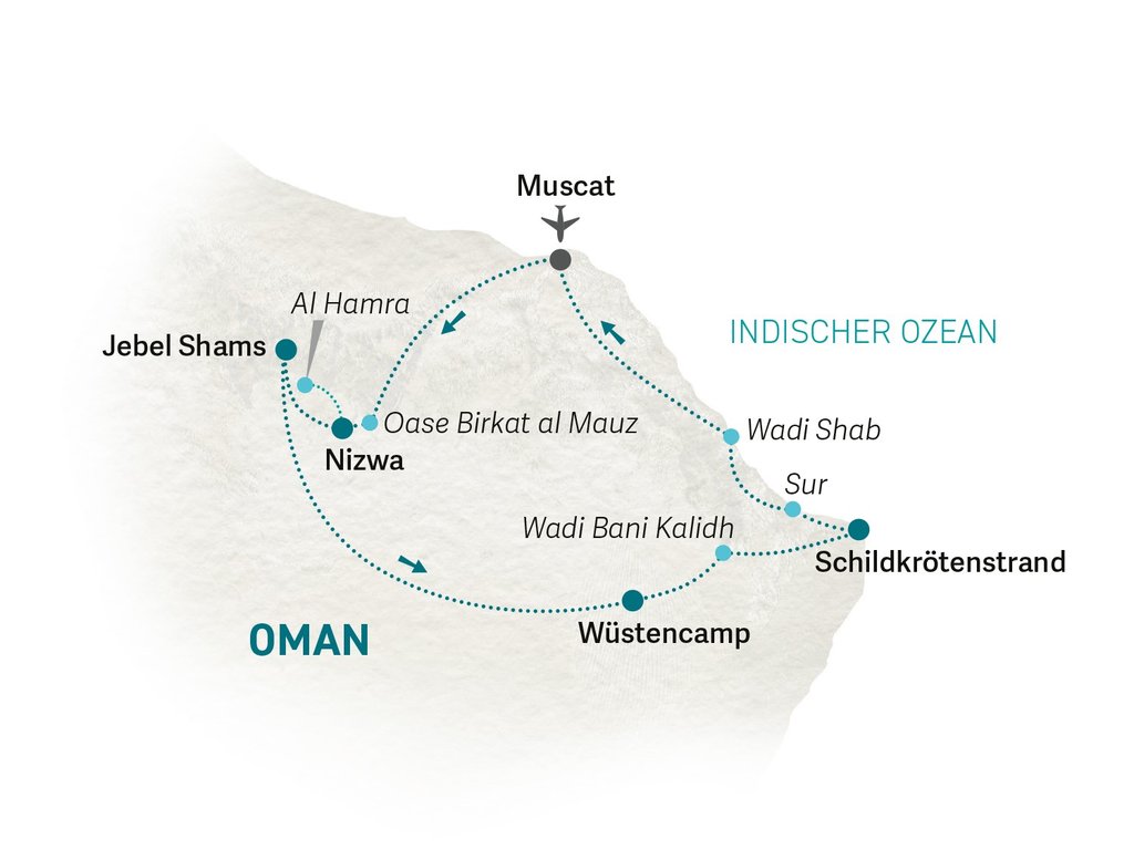Ihr startet in der Hauptstadt Muscat mit ihrem prachtvollen Sultanspalast, dem quirligen Souk und der berühmten Moschee. Danach geht es ins Landesinnere zu grandiosen Gebirgszügen, grünen Oasen und kulturellen Höhepunkten. Ein Highlight ist die Übernachtung im Beduinenzelt inmitten der Wüste Wahiba. Mit etwas Glück beobachtet ihr anschließend in Ras-Al-Jinz bei einer Nachtwanderung große Meeresschildkröten bei der Eiablage. Am Ende der Reise empfehlen wir euch zum Beispiel eine individuelle Badeverlängerung im luxuriösen Shangri-La Resort oder im hochwertigen Crowne Plaza direkt am privaten Strand.