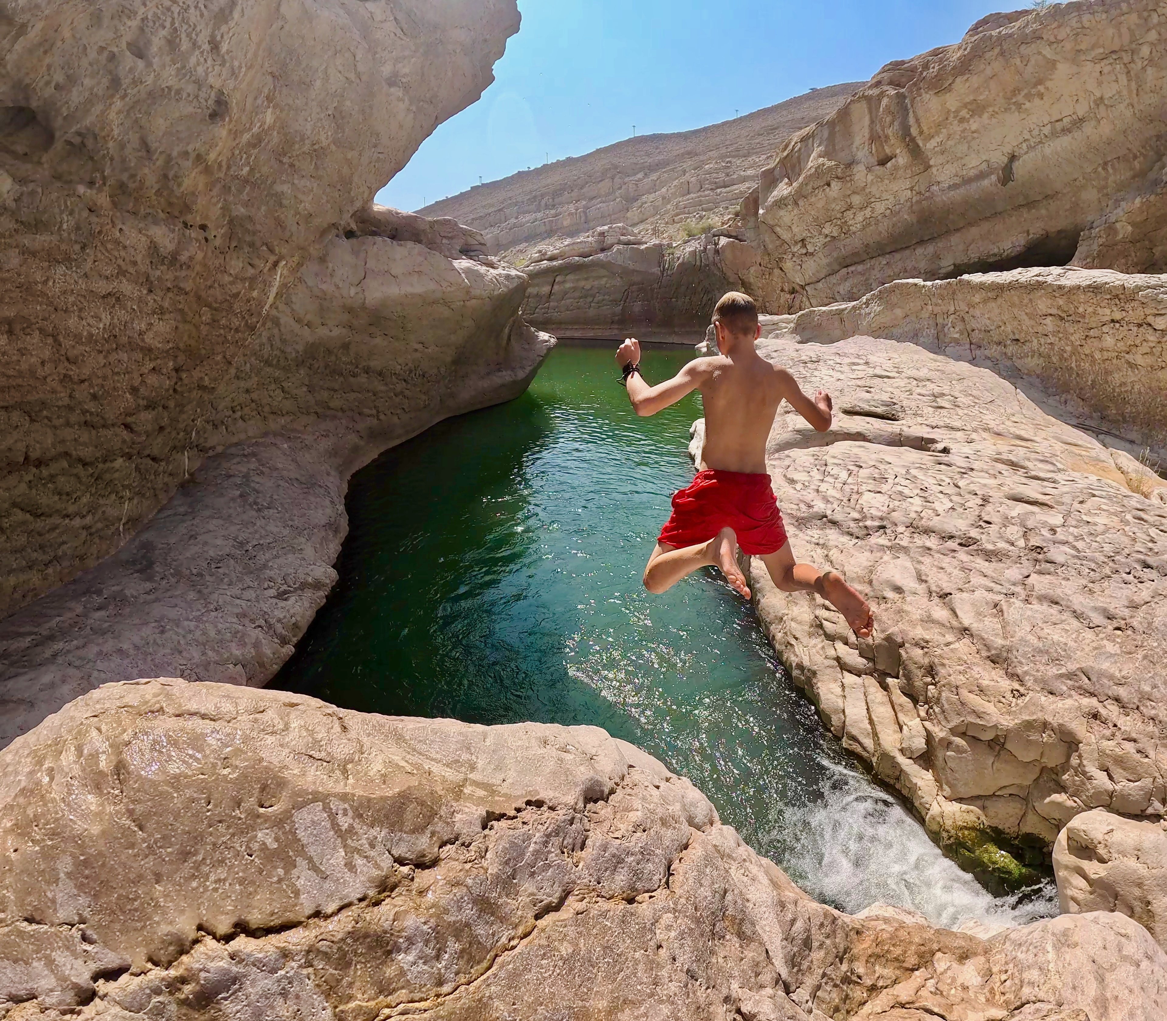 Unterwegs empfehlen wir für Naturliebhaber und mit älteren Kindern auch noch einen Stopp im Wadi Shab – ein echtes Naturerlebnis: Palmen, wilde Feigenbäume, geheimnisvolle Höhlen und Wasserpools. Das Flussbett Wadi Shab sieht aus wie eine orientalische Variante des Grand Canyon. Ihr wandert ca. 90 Minuten durch eine einzigartige Felsenlandschaft (bitte festes Schuhwerk mitnehmen, die Steine sind groß und der Boden oft uneben, teils muss man etwas klettern). Alternativ setzt ihr vom Parkplatz mit dem Boot über und geht zu Fuß ca. 45 Minuten. Dann schwimmt ihr durch 3 verschiedene Wadi-Becken bis zu einer Höhle mit einem Wasserfall – eine tolle Erfahrung. In der Höhle kann man allerdings nicht stehen, also nur für gute Schwimmer geeignet und teilweise ist es sehr eng. Eine wasserdichte Tasche für Geld, Handy und Autoschlüssel ist auch zu empfehlen.
