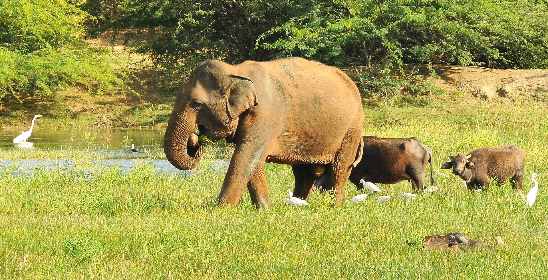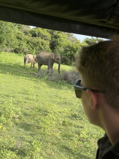 Vom offenen Jeep aus beobachtet ihr die Tiere ganz aus der Nähe: wie sie die saftigen Gräser zupfen, Jungtiere trinken oder den Müttern folgen – ein unglaublich eindrucksvolles Erlebnis. Auch Wasserbüffel, Pfauen, Axishirsche, Ceylon-Hutaffen und Warane lassen sich im Park entdecken.