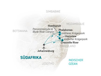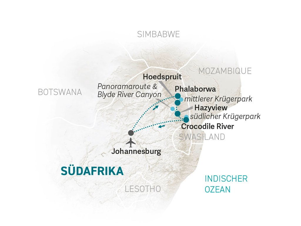 Nach eurer Landung in Johannesburg werdet ihr von uns am Flughafen empfangen und holt gemeinsam euren Mietwagen ab. Nun startet eure Familienreise entlang des Krüger Nationalparks.