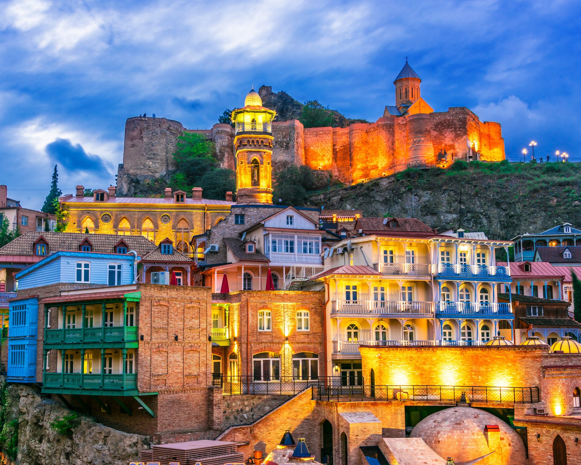 Unten angekommen lädt das historische Bäderviertel Abanotubani mit seinen markanten Kuppeldächern und dampfenden Schwefelquellen zu einer kleinen Zeitreise ein. In den engen Gassen der Altstadt lassen sich bunte Häuser, Straßenkunst und familienfreundliche Cafés entdecken, während im nahegelegenen Rike-Park Spielplätze und grüne Flächen zum Verweilen einladen.