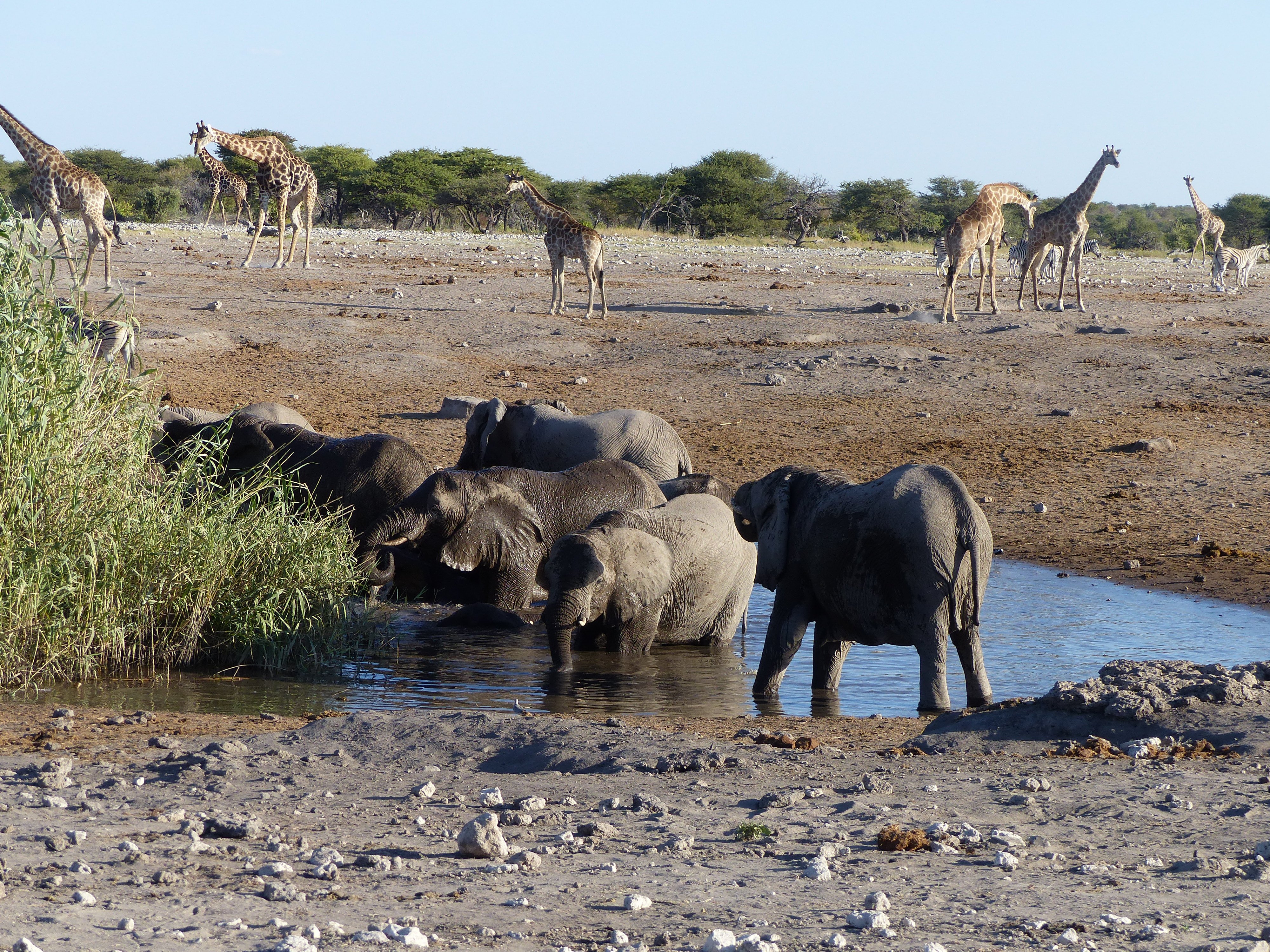 Vom Safarifahrzeug haltet ihr Ausschau nach den hier vorkommenden Tieren der berühmten Big Five. Büffel halten sich im Etosha nicht auf, aber ihr könnt Elefanten, Nashörner, Leoparden und Löwen sowie auch Antilopen und Giraffen beobachten.