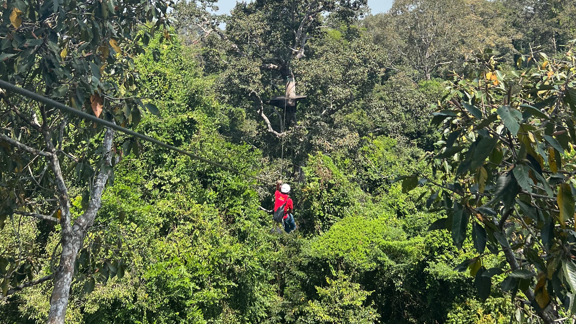 Frau beim Abenteuer-Ziplining über den Bäumen – Kambodscha Reise mit Kindern