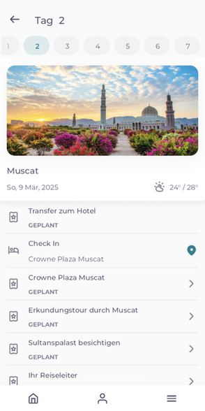 Darunter ist euer Reiseverlauf übersichtlich aufgeführt. Auf einen Blick seht ihr, an welchem Tag ihr euch wo befindet und wie das Wetter vor Ort ist. Mit einem Klick auf den Pfeil rechts gelangt ihr zur ausführlichen Tagesbeschreibung. Zuerst aufgeführt sind alle für diesen Tag geplanten Aktivitäten, wie Transfers, Check-in in eurem Hotel sowie vorgesehene Programmpunkte.