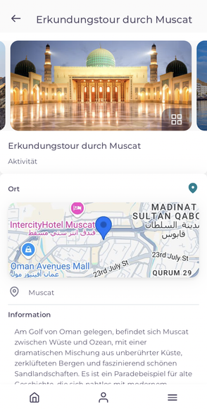 Auch hier habt ihr die Möglichkeit, über den Pfeil weitere Informationen inklusive Standort und Bildern zu eurer Unterkunft und den Aktivitäten aufzurufen.
