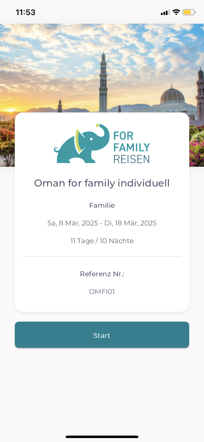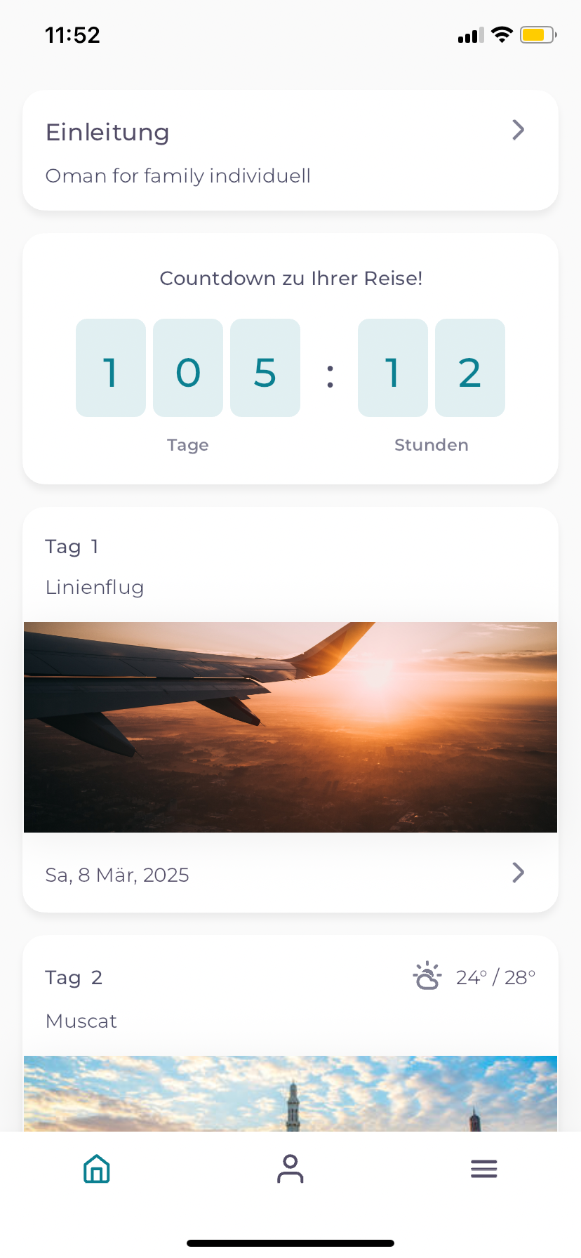 Alle Reiseinformationen werden geladen und mit Klick auf „Start“ könnt ihr diese abrufen. Nun gelangt ihr zur Reiseübersicht, die ihr auch über den Home-Button erreicht. Oben in der Ansicht findet ihr den Reiter „Einleitung“, wo ihr eine Zusammenfassung der Highlights eurer Familienreise findet. Um eure Vorfreude zu steigern, zählt der Countdown die Tage bis Reisebeginn.