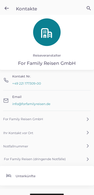 Das Icon unten in der Mitte führt euch zu allen wichtigen Kontaktdaten. Hinterlegt sind die Telefonnummer und die E-Mail-Adresse von For Family Reisen sowie die Kontaktdaten unseres Partners vor Ort. Außerdem findet ihr dort unsere 24h-Notfallnummer, unter der ihr For Family Reisen jederzeit erreichen könnt, falls ihr wegen unvorhersehbarer Umstände sofortige Hilfe benötigt.