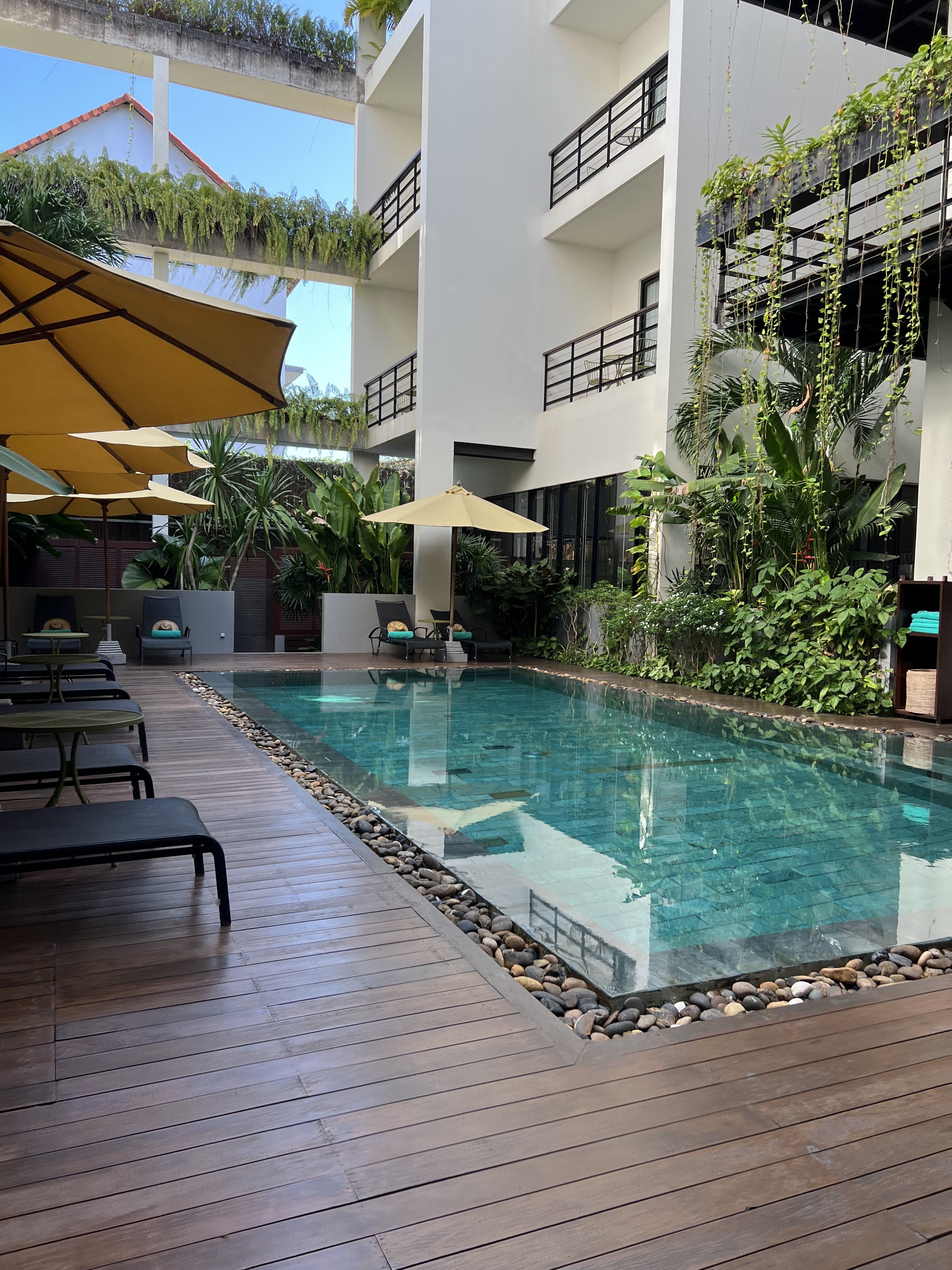 Im Herzen der Stadt Siem Reap, unweit der bekannten Pub Street und Nachtmärkte, befindet sich die urbane Oase Aviary. Das umweltfreundliche Hotel, welches Moderne und kambodschanische Tradition in seiner Architektur und Innenausstattung vereint, bietet einen wunderbaren Rückzugsort in der belebten Stadt Siem Reap. Euch erwartet ein Spa- und Wellnesscenter sowie ein Pool im Innenhof. Das Hotel verfügt zudem über eine schöne Dachterrasse mit Bar und ein hauseigenes Restaurant.