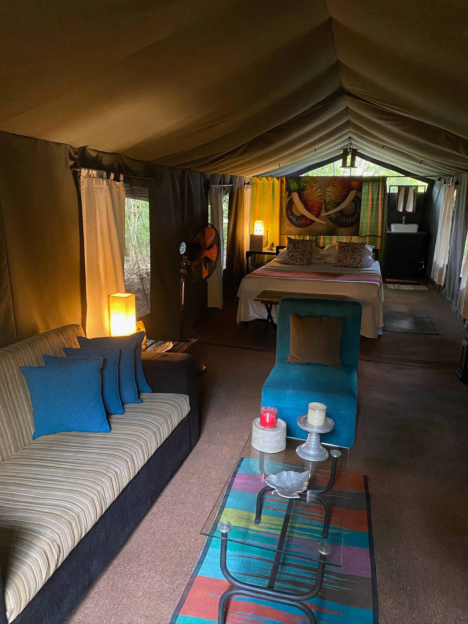 Während des Aufenthaltes übernachtet ihr in Zelten, welche verschließbar sind und jeweils über ein abgetrenntes Badezimmer verfügen. Zur weiteren Ausstattung zählen komfortable Betten und eine Sitzecke.