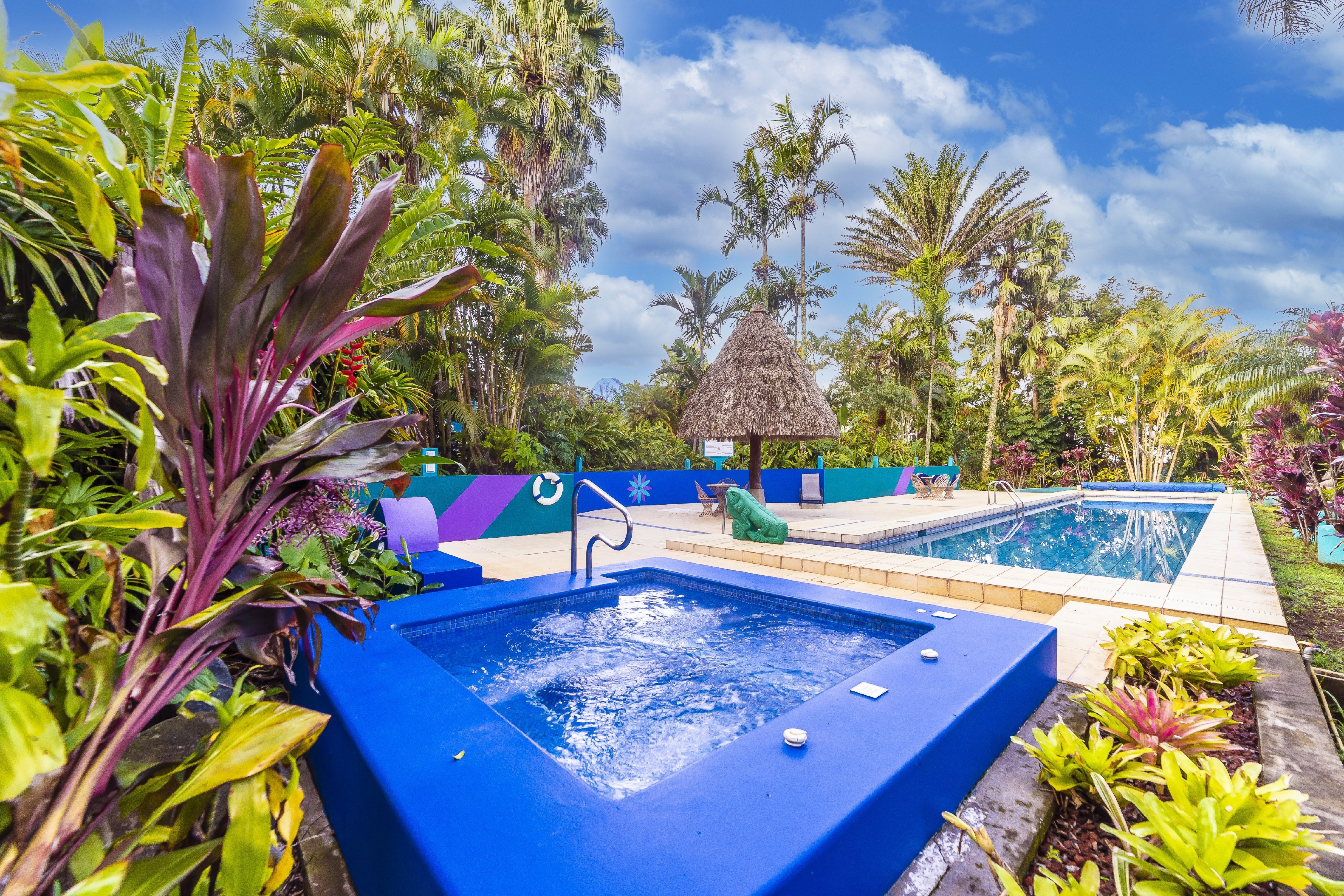 Zu den Annehmlichkeiten des Hotels gehören drei hoteleigene Pools, die zum Entspannen einladen, während die Wanderwege durch die hauseigenen Gärten und zu Wasserfällen im tropischen Dschungel für Abenteuer sorgen. Ein ausgezeichnetes Restaurant, eine Bar, ein Kunstladen und ein Fernsehzimmer. Ein Jacuzzi und 5 private, mit Palmzweigen gedeckte Pavillons ergänzen das exklusive Hotelangebot.