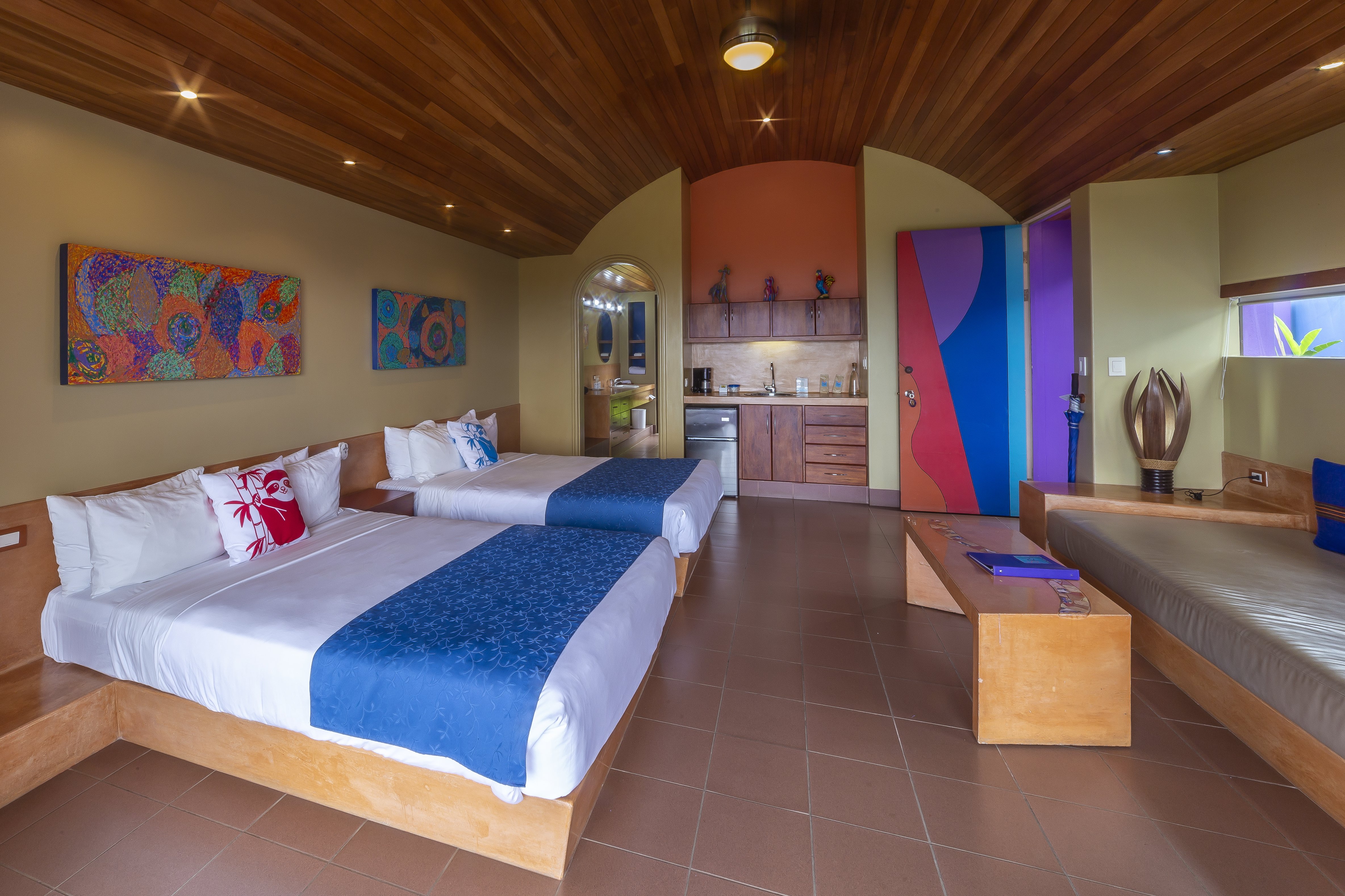 Die großzügigen Villen im Xandari Costa Rica sind individuell gestaltet und vereinen modernen Komfort mit lokalem Kunsthandwerk. Jede Unterkunft verfügt über große Fenster und eine Terrasse, die einen spektakulären Ausblick auf die umliegende Landschaft bieten. Hochwertige Doppelbetten, ein Schlafsofa, moderne Badezimmer und kostenfreies WLAN sorgen für einen erholsamen Aufenthalt. Die ökologisch geführte Hotelanlage mit Spa, eigenem Gemüseanbau und einem botanischen Garten mit Spazierwegen sowie Swimmingpools und vielen eindrucksvollen kreativen Kunstwerken ist ein Geheimtipp für alle, die ein ausgefallenes farbenfrohes Ambiente suchen.